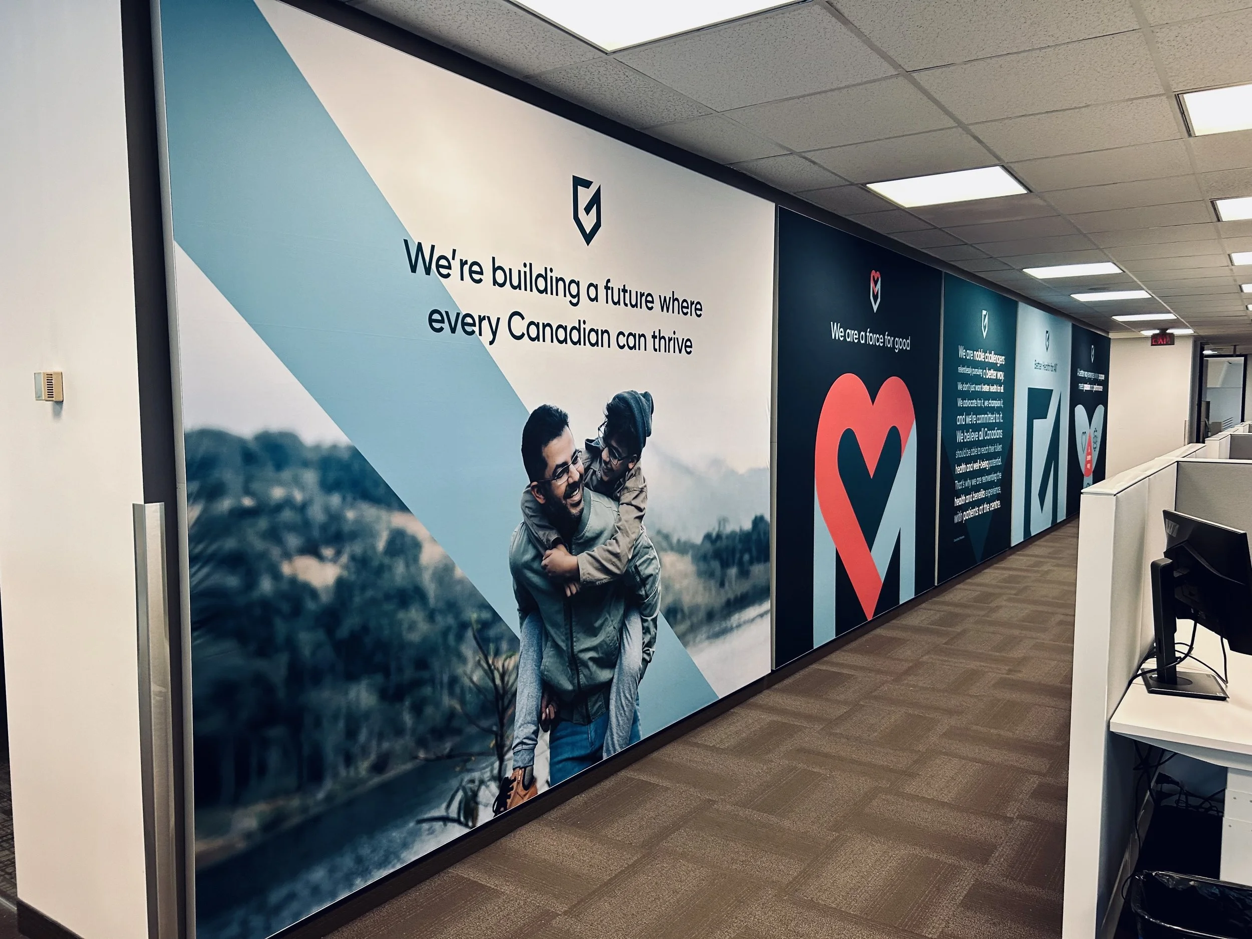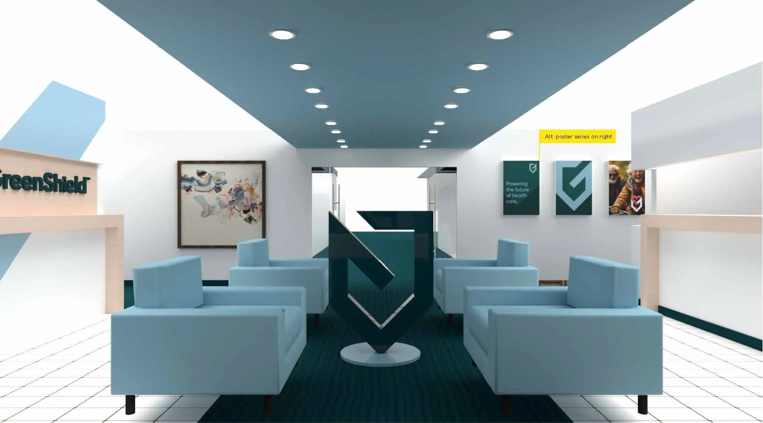 Over the past few years, GreenShield has acquired multiple businesses to enhance its payer-provider model, necessitating the creation of a unified and consistent brand presence across all GreenShield locations in Canada. To achieve this, all elements were designed and made available à la carte, compiled on order sheets, and included in an environmental guide to facilitate budget alignment, agency, and vendor management. Multiple design options, including posters, mural treatments, furniture recommendations, and paint colors, showcased the brand and messaging cohesively.